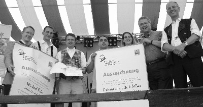 左端=シュナップフ州環境大臣。右端=バライス市長。中央は適用マークをうけた事業者。 ビール祭りの期間中は日によって店が半日で閉まることも。 |