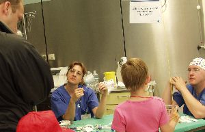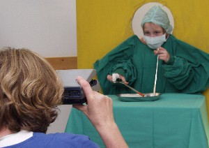 ![]() 【ニュース】 シリーズ 『オープン・ドア』 エアランゲン小児・青少年クリニック 夏になると、エアランゲンの街ではオープン・ドア・デーとして様々な施設や機関が開放する機会が増える。その多くがスタッフの手作りで、施設の機能や役割を説明する機会だ。市民にとっては市内の施設や機関がどのようなものかを知ることができる日である。今年のエアランゲンのオープン・ドアを順次レポートする。 『はい、こっちを向いて、撮るわよ』。穴から顔を出して、手術用の衣服の袖に手を通し、外科医になったつもりになった子供がポーズをとる。ちょうど観光地によくある顔をはめこんで記念撮影をするたて看板のようなあんばいだ。ポラロイドカメラのフラッシュが光る。