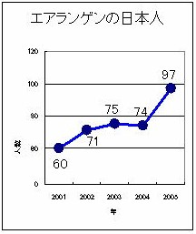 1970 年の時点で 7%であったが、ゆるやかに増加している。1980 年で 10%を超え、90 年代後半からは 15%程度を維持している。同市の場合、大学街であり、グローバル企業のシーメンス社の一拠点であることから外国人の中には留学などで同市に住んでいるケースも多い。ちなみに日本人住人の数は 97 人(2005年)だ。 1974 年にはエアランゲンの在住外国人による『アウスレンダー・バイラート』がつくられた。直訳すれば『外国人諮問委員会』『外国人顧問会』といったところで、市内で一定の存在感がある。また近年インターナショナルスクールの整備にも力をいれている。企業誘致等の経済政策と歩調をあわせるかたちだ。 ドイツの人口は約 8 千 250 万人。8.8%が外国人である。 エアランゲンの位置するバイエルン州は 9.4%。1988 年には二重国籍を認めるように向けた議論が高まったが実現しなかった。(了) <参考>10万人都市に約100人 2001年の段階でエアランゲンの日本人の住人は60人。その後、増加傾向にある。(左グラフ・エアランゲン統計局資料を元に作成)ちなみにドイツ国内で最も日本人の多い都市は、多くの日本企業が集まるデュッセルドルフ。人口約57万6000人のうち4.7%が日本人。 編集後記 グローバリゼーションと学校 ◆バイエルン州が母国語による授業をはじめたのは、直接的には帰国を前提にした外国人労働者の子弟のためです。しかしそこには、固有の文化を認め、尊重するといった意味を見出せますし、少なくもとも授業廃止に対する反対意見の理由のひとつになっています。 ◆母国語授業の廃止の背景は、予算の問題のみならず、ドイツ語を強くすべきといった意見があるようです。また、近年ドイツの学力低下が問題になっていましたが、ドイツ語をきちんと習得していない外国人の子弟が学力低下の一因という見る意見もあります。 ◆一方、インターナショナルスクールは自治体が国外からの企業誘致を行うときに必要になってくるインフラのひとつです。大学の街でもあるエアランゲンの場合ですと、優秀な研究者の誘致にも一役買うことが考えられます。 ◆学校という範疇で『文化・人権の尊重』『企業・人材の誘致』というふたつの文脈が地域社会に同時におこってきています。この現象をひとことでいえばグローバリゼーションという言葉に集約されると思いますが、今後も注視したいと思います。(高松 平藏) |