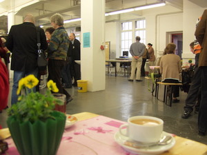 この催しは先月17日に市の『文化と余暇』局の主催で行われているもので、今年で5回目を数える。毎年テーマが決められ、文化関係者や関心のある市民が参加する。講演と分科会、そして分科会での議論の発表という構成で午前9時半から午後4 時半まで、たっぷり1日かけて話し合われる。今年は『アーティストは街を描く、(同時に)街を特徴づける』と題され、公共空間での芸術作品がテーマになった。 冒頭にヨハネス・キルシェンマン教授が講演を行い、『街の中での公共空間では議論が生まれるような空間である必要があり、公共空間での芸術作品も議論を喚起するものが好ましい。しかし最近は議論の喚起というよりもエンターテインメントに傾く傾向がある』と述べた。 次に同局の責任者、ディーター・ロスマイスル博士が芸術家団体の代表やギャラリーの経営者、ギムナジウム(中等教育機関)の芸術の教諭らと対談を行った。 分科会では各テーマにそって(1)現状認識、(2)問題点、(3)ポジティブな批評、(4)問題に対する具体策 といった手順で話し合われる。分科会は次の4つのテーマにわかれて行われた。