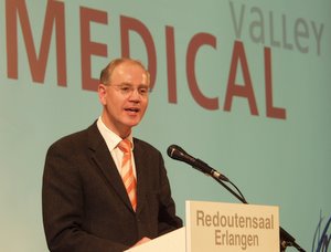 というビジョン ■市長になる前は経済局の局長でした。医療分野のトップの都市をめざすというアイデアはこの時から持っていたのでしょうか。 『私が経済局長になったのは1988年。その翌年、ベルリンの壁が崩れますが、旧東ドイツで品物やサービスの需要が高まります。それを受けて、エアランゲンも景気がよかった。ところが、好景気に隠れて経済の構造的な欠陥が見えてこなかった』 『ほどなくして、景気も悪化していきます。93年には市内の労働市場が急速に減り、失業率が上がりました。エアランゲンに昔からあった大きな企業も倒産する始末です』 『そこで行ったのが調査です。企業の従業員の代表組織と一緒にエアランゲンの強みはどこか、どこに力を入れて職場を増やすべきかといったことを1993-95年にかけて研究しました。そして見えてきたのが、医療と健康に関して他の街にない強さでした』 ■なるほど。それから戦略として構想していったわけですか。 『いえいえ。街の強みがわかってきて、まずは大学と企業、とくに医療関係の分野でネットワークを作ろうとしました。しかし、まだこの時点では医療都市というビジョンはありませんでした』 『1996年に市長に選ばれました。当然市長として新しい市政方針が必要です。前市長の場合は環境問題をかかげ、自転車道の整備などを行い、「環境首都」に輝いています。環境問題はもちろん重要で、前市長の政策は引き継いでいますが、政治家としては、独自のものを出していかねばならない。そのときに医療関係に強い特長を思い出した。市長就任後のはじめてのスピーチに医療都市という言葉をいれました』 『スピーチを終えたあと、盟友である副市長がやってきて「勇気あるビジョンだ」とコメントしてくれました。その後、彼ともう一人のスタッフが中心となってこのビジョンをすこしづつ拡大してくれました』 ■市長就任から10年をこえました。医療都市という政策をどう評価していますか 『1999年と2005年の2回にわたり医療技術や健康をテーマにした年間モットーをかかげました。市民の健康のためにがんばることは大変喜ばしいことです。その結果、市民のあいだでは健康に対する意識が他の街の市民よりはるかに強い。今年の夏にはある調査で健康的な街として84の大都市のうち2位になった。1位はウルム市です。現在の目的はウルムをおいかけ、ウルムを越えることです』 『それから私は経済学出身なので職場数のことを最も気にします。そのへんでいうとメルケル首相が述べた「職場をつくることは、社会的なことである」という意見には同感です。現在エアランゲンではすばらしい記録がある。10万4000人の人口に対して9万の職場があります。そして新しくできた職場というのは医療関係が多い』