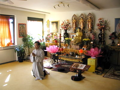 ■法人の拠点はビルの一室。ここには黄金の仏像が鎮座し、まるでお寺のような雰囲気ですね。非営利法人はいつから活動していますか 『8年前からです。当法人の範囲はニュルンベルク周辺のフランケン地方全体を対象にしています。正月などは600−700人程度集まりますね。この時は中国の人もよく来ますよ』 『設立と同時に若者のグループもつくりました。こちらのグループは2週間ごとに集まり、仏教を学ぶことはもちろん、語学、音楽、獅子舞などをやっています』 ■ングエンさんが取り組んでいる獅子舞は中国やベトナムなどでみられるスタイルのものですが、このチームはアジア関係のイベントなどでも活躍しているようですね。 『メンバーの都合にもよりますが、年間3〜7回程度の公演の機会があります。最近でしたらニュルンベルク空港のフェスティバルや同市で毎年行われるアジア・ナイト・マーケットというイベントなどに出ています』 ■アジア・ナイト・マーケットは野外で行われる大規模イベント。アジア各国の食べ物を楽しめる屋台がたくさん出るほか、特設舞台では伝統芸能などアジア文化を紹介する短い公演がたくさん行われますね。 『はい。しかし、それらの7割程度がドイツ人のグループです。3割が“本物”のアジア人です』 『われわれは自分の文化を紹介しようと考えていますし、お客さんも“本当のアジア”の文化に触れることに期待しているように思います。アジアの伝統芸能の公演で演者がドイツ人、となると、お客さんの反応はがっかりしているのがわかる』 ■公演はどんなかたちですすめていますか 『私も楽器演奏をしなければならないときがあるのですが、進行に徹することができるときは演じる前に獅子舞の意味などを説明するようにしています。私の経験からいえばそのほうが見ている人たちは喜んでくれます』 仏教は文化・哲学