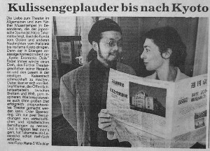 | バックステージでの話し合い、京都まで伝わる 日本のジャーナリスト、高松平藏は劇場全般が好きで、特にフュルト市の市営劇場が気に入っている。彼は「ゴレム(最近行なわれた芝居)」のはなしや、そのほかの劇場のニュースを遠い京都まで伝えている。 エアランゲン市在住の日刊京都経済のジャーナリストはフュルト劇場のはなしを、昔の日本の首都、京都の編集者と読者に読ませる方法を見つけたようです。(「ドイツの地方ニュースは京都の新聞には不用だが、ニュースバリューをつけて掲載を可能にしている」という意味) 同劇場のプレス担当、ベッティーナ・ビエマーと彼はよく話し合ったりします。例えば、十分予算がなくともクオリティのいい劇場マネジメントをどうするかということやスポンサリングについてなどです。こういったアートと経済の結びつくところだけを取り上げているのです。「読者の声」によるとこういうテーマは日本でもよく受けているようです。(了) |