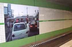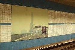 | ニュルンベルクの地下鉄の駅に展示された私の写真。サイズが小さいのでわかりにくいが、ジェロームさんによって加工されている。写真左は関空から大阪に向かう途中の橋の上。右は大和高田市近鉄浮孔駅のそば。 |