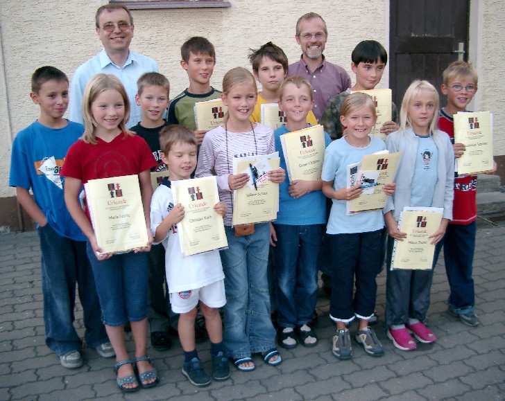 Die Höchstadter Schachtrainer Reiner Schulz und Gerhard Leicht lehrten an vier Nachmittagen acht- bis dreizehnjährigen Schülern das Schachspiel. In einer Fortgeschrittenen- und einer Anfängergruppe wurden zahlreiche Themen behandelt: Figuren und ihre Zugmöglichkeiten, besondere Regeln wie Rochade und Patt, aber auch Eröffnungstricks und Mattaufgaben. Am Freitag, dem fünften Nachmittag, bewiesen die Schüler beim Schnellschachturnier ihr Können. Acht Jungs und vier Mädchen mußten unter Zeitdruck ihre Partien spielen. Bei den Anfängern gewann Juliane Schaaf vor Maike Herla und Joschka Schakies, bei den Fortgeschrittenen war Max Riegler vor Florian Hoch und Peter Leicht siegreich. Bei der abschließenden Siegerehrung erhielt jeder Ferienprogramm-Teilnehmer eine Urkunde, Schachlektüre und die neue Schach-Vereinszeitung.