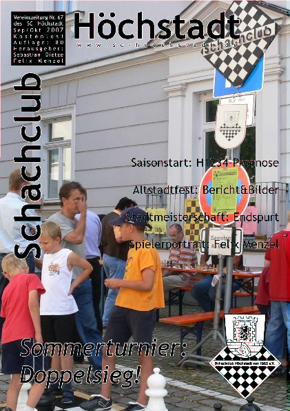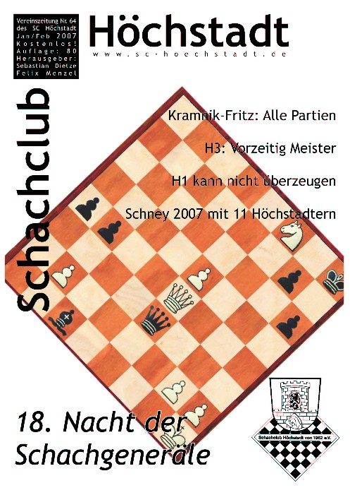 Einige Berichte und Informationen aus der Ausgabe 67 hier Neu: Die gesamte Schachzeitung (in Farbe) im pdf-Format (4,2 MB) zum Herunterladen Falls jemand Interesse an der gesamten Ausgabe (Papier) hat, schickt bitte ein E-Mail an Reiner Schulz.